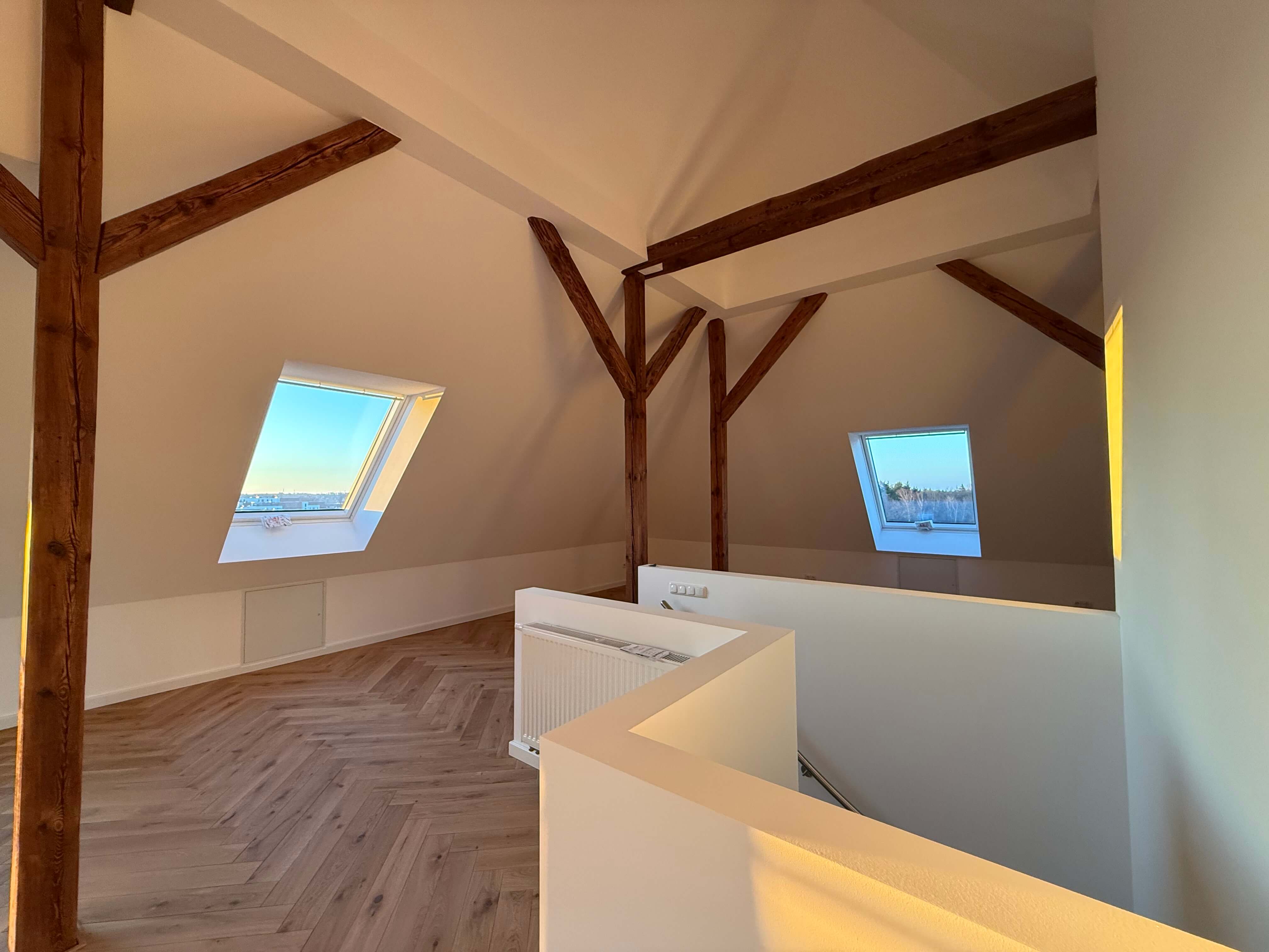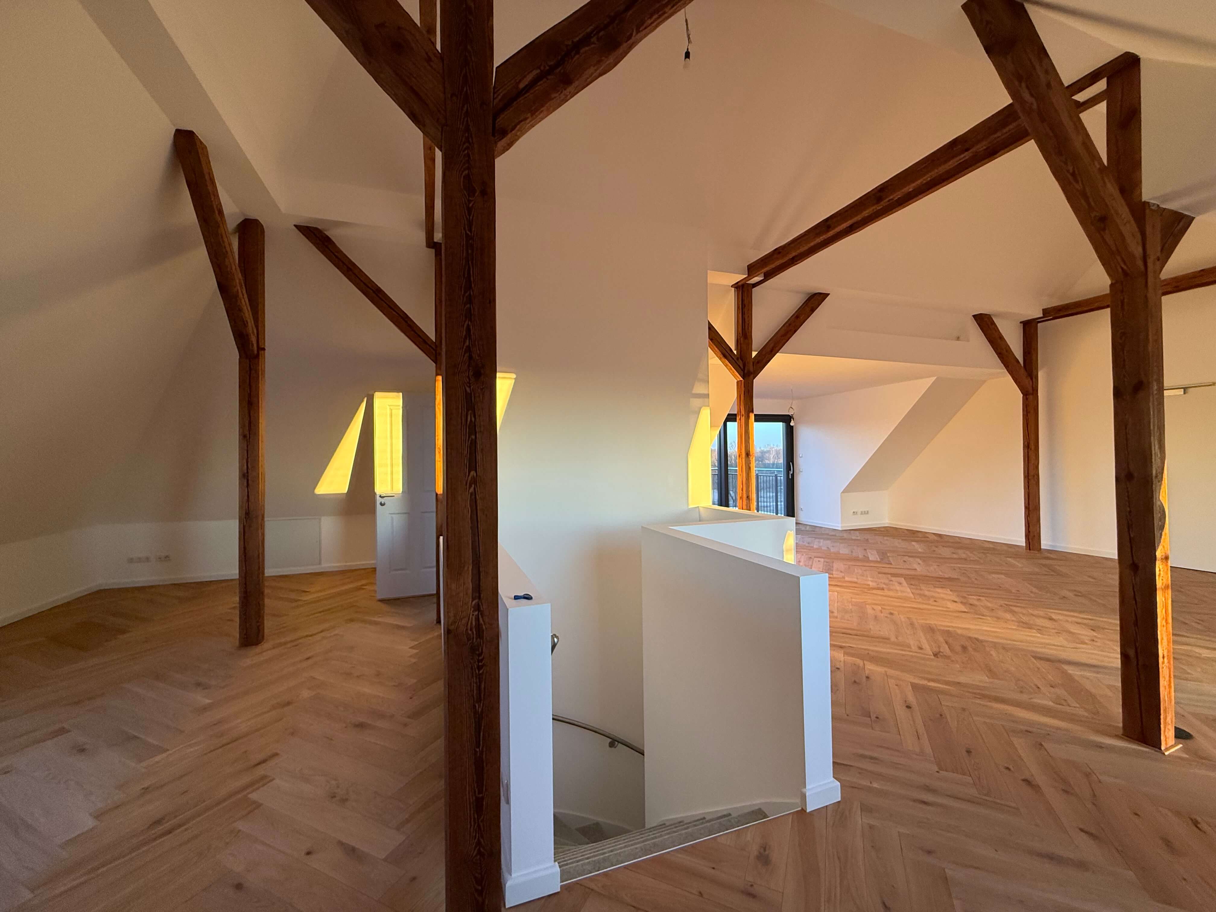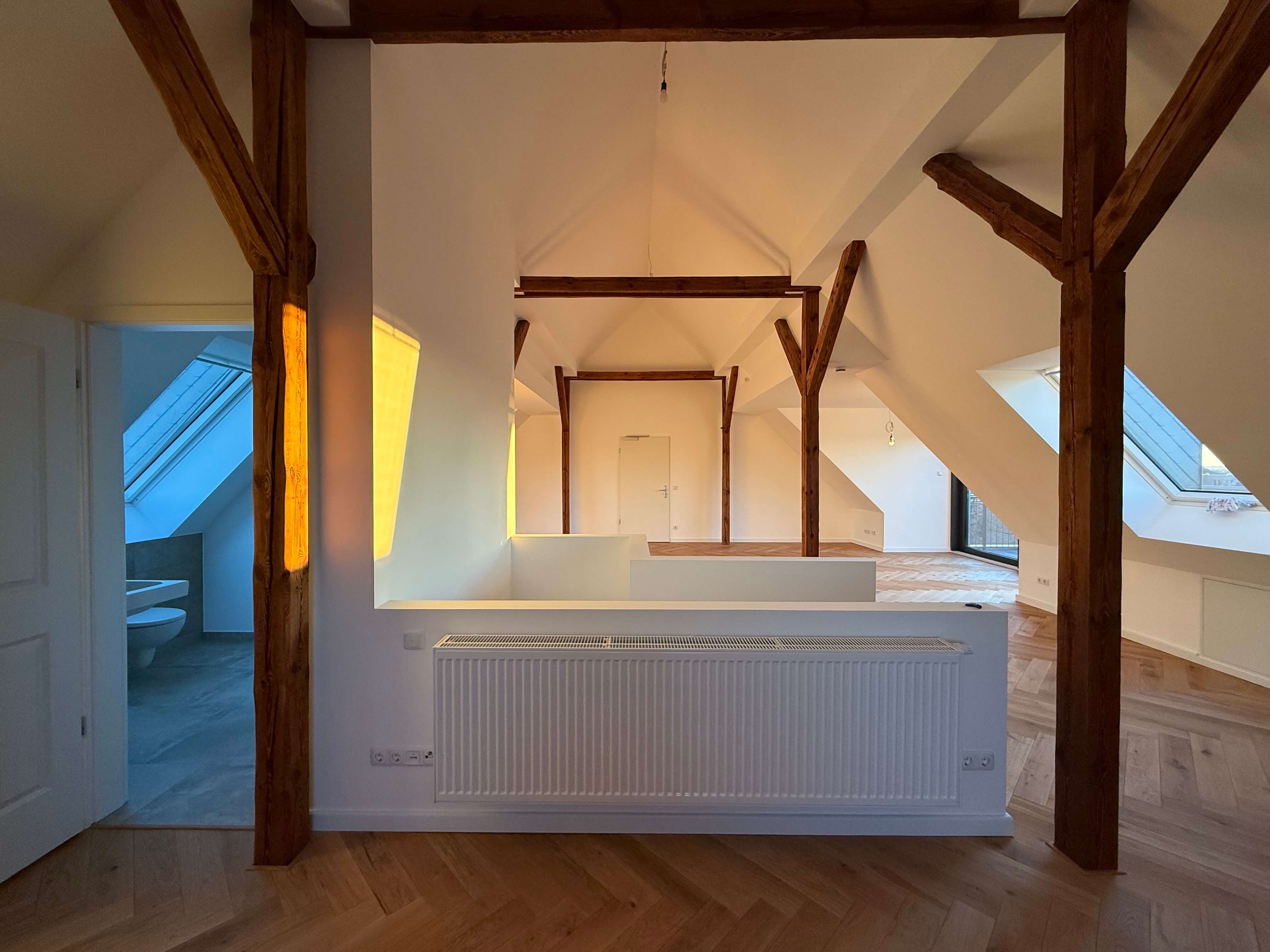 Auf ca. 134 m² entfaltet sich ein Zuhause, das mit hochwertigen Materialien, edlem Fischgrätparkett und einer Ausstattung auf höchstem Niveau begeistert. Die hohen Decken im Dachgeschoss und die frei stehenden Holzbalken schenken der Wohnung einen warmen Loft-Charakter – großzügig, stilvoll und mit genau der richtigen Portion Gemütlichkeit.