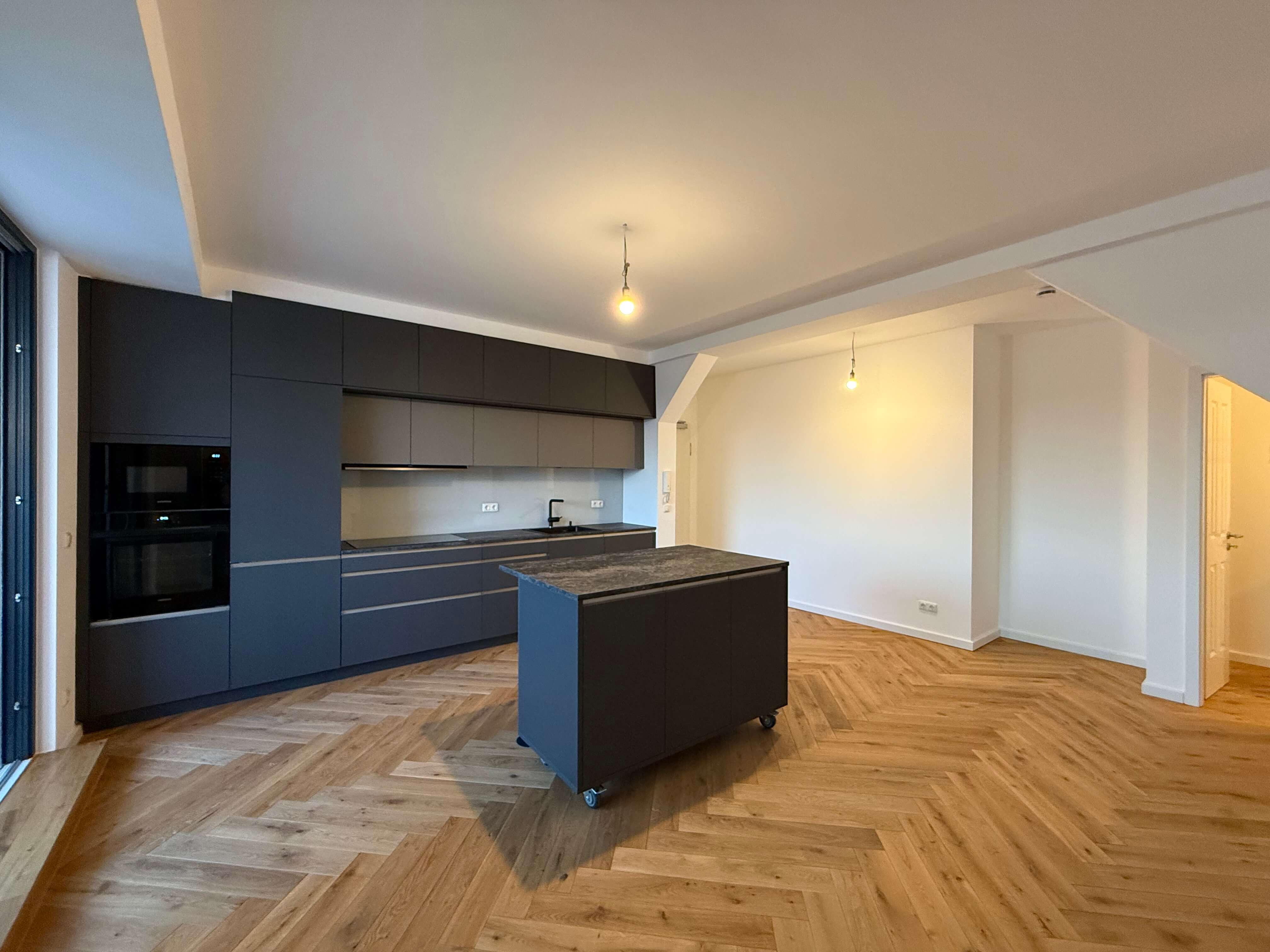 Die elegante, dunkle Küche mit einer bewegbaren Kücheninsel lädt zu kulinarischen Kochabenden ein. Hier wird nicht nur gekocht, hier wird gelacht, probiert, angestoßen. Freunde stehen mit einem Glas Wein an der Insel, jemand rührt in der Pfanne, und plötzlich ist es viel später als geplant. Direkt angrenzend befindet sich die Loggia für den schnellen Espresso am Morgen (ein kleiner Kurztrip nach Italien, ganz ohne Flugticket, aber mit umso mehr Genuss).