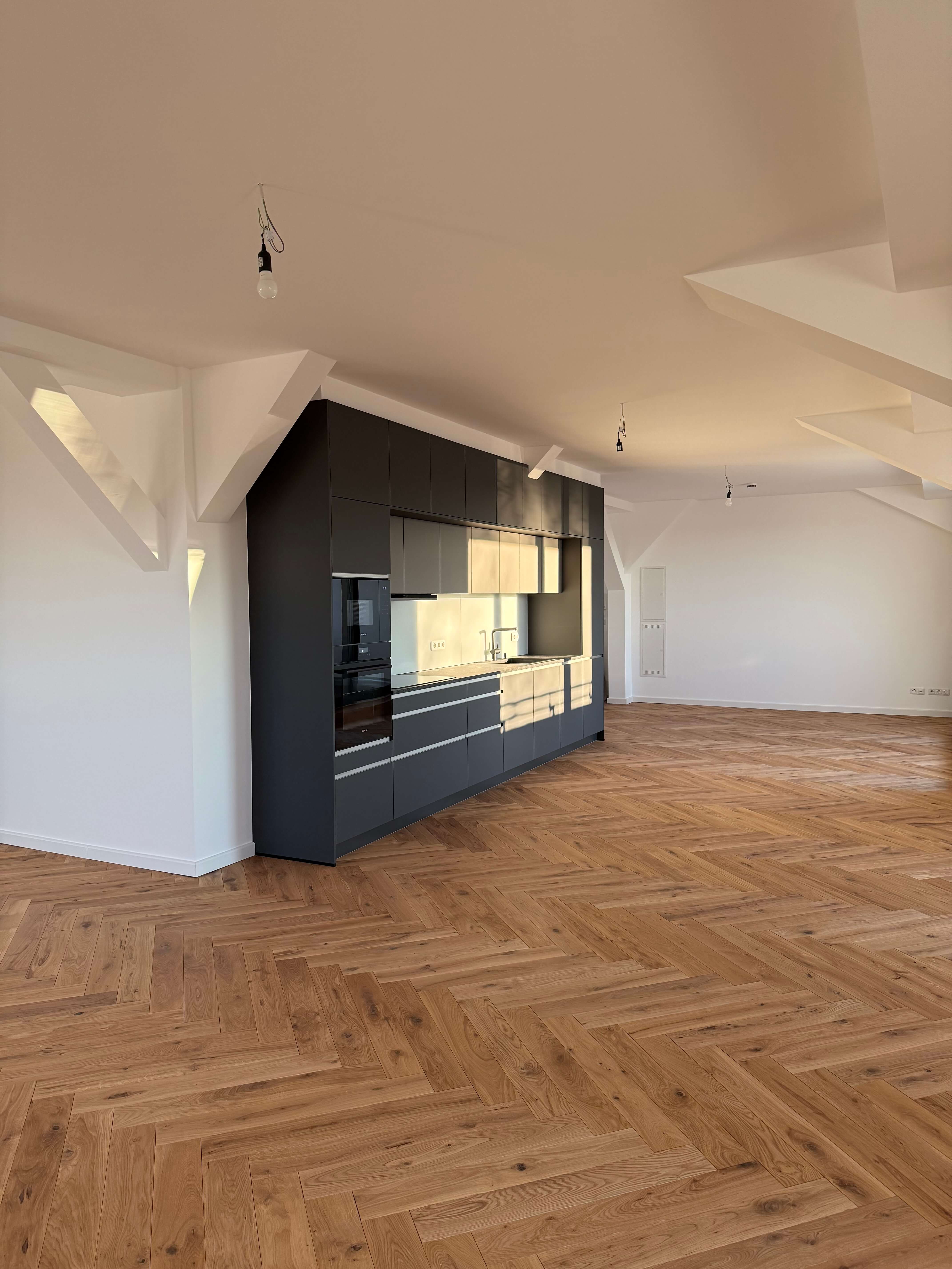 Auf ca. 116 m² erwarten Sie lichtdurchflutete Räume mit großzügigen Fensterflächen und edlem Fischgrätparkett aus ökologischen Materialien. Die dunkle Designküche setzt ein elegantes Statement und überzeugt mit Qualität, Funktionalität und klarer Ästhetik.